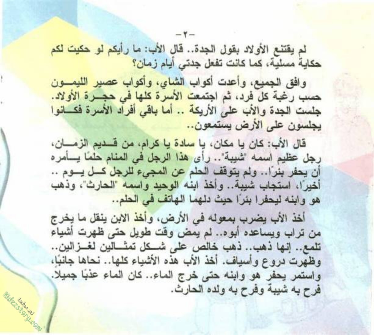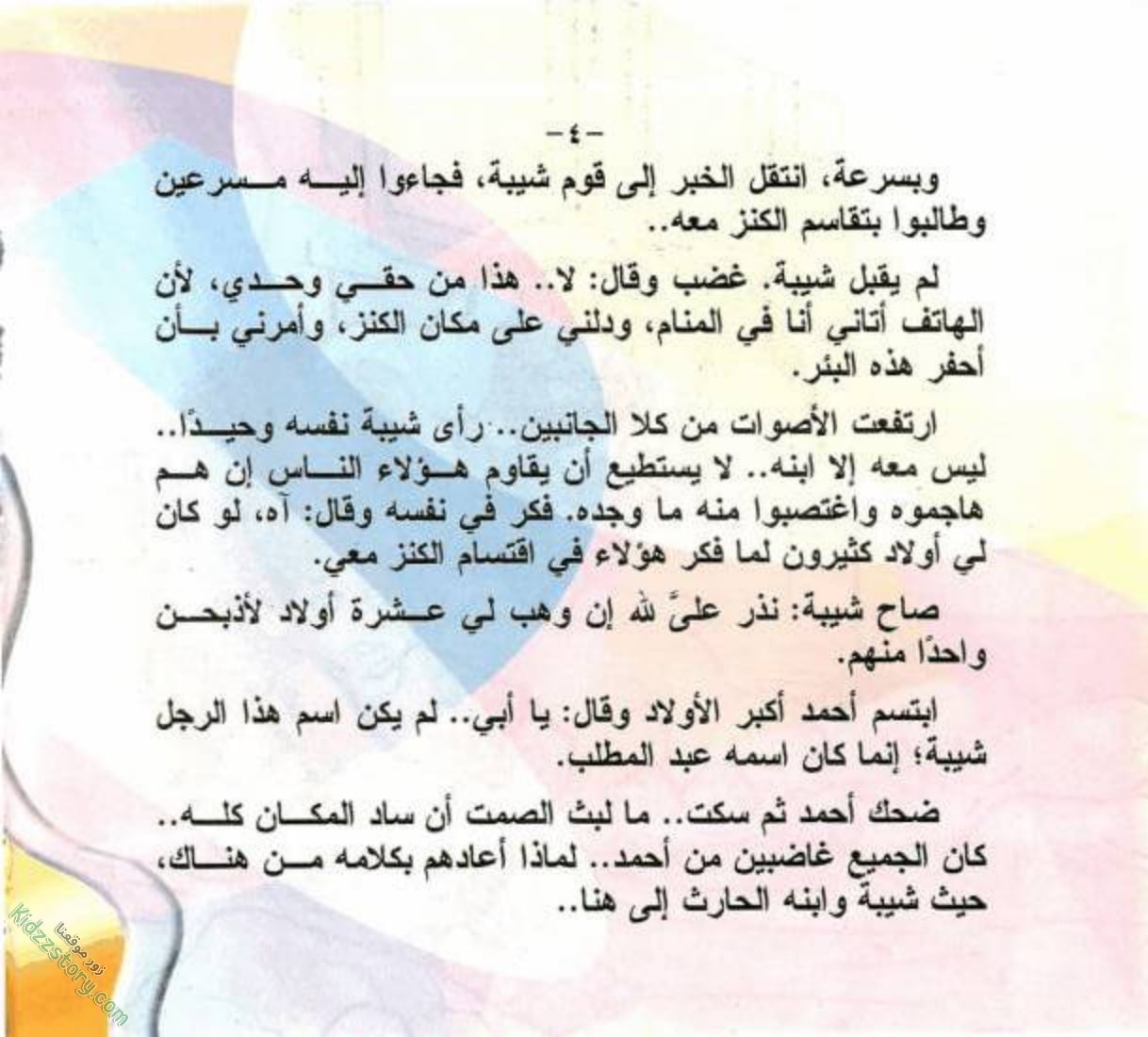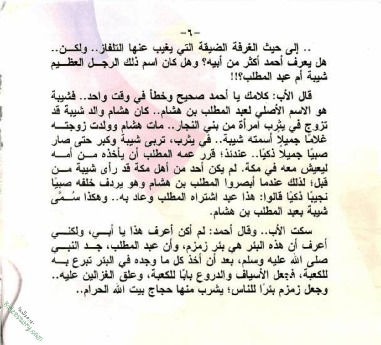 يجتمع الجميع في شغف، وتبدأ حكاية الأب عن رجل عظيم يُدعى “شيبة”، أمره حلم متكرر أن يحفر بئراً في مكان مهجور. وبمساعدة ابنه الوحيد، لا يجد شيبة الماء العذب فحسب، بل كنزاً من الذهب والأسلحة. لكن هذا الكنز يثير طمع قومه، فيشعر بالضعف وينذر نذراً غريباً سيغير تاريخ البشرية: إن رزقه الله بعشرة أبناء، فسيضحي بأحدهم. من هو هذا الرجل العظيم؟ وهل سيُنفذ نذره الصعب؟ انضموا إلينا في قصة يوم تعطل التلفاز لتكتشفوا كيف تحولت ليلة مملة إلى درس تاريخي ممتع عن حفر بئر زمزم، وفداء جد الرسول الكريم، وسحر الحكايات التي تجمع الأسرة.